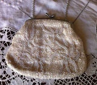 Vends pochette ivoire avec chaînette cousue de perles. ETAT NEUF;