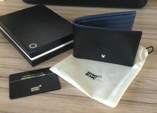 Vends portefeuille homme Mont-blanc Meisterstück, 6 cartes, nouvelle collection, noir extérieur et bleu intérieur. Cuir Jamais servi état neuf dans boîte avec certificat d'origUne