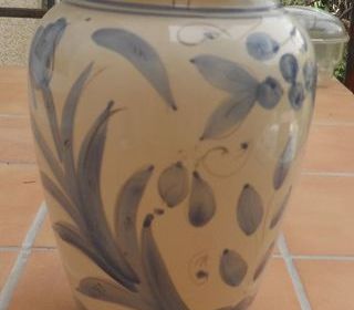 Vase beige en céramique décoré de fleurs bleues neuf AN 70 gravé dessous 766C et une sorte de signature que je n'ai pas pu identifier Hauteur 30 cm ? Base diamètre 13 cm et bouche