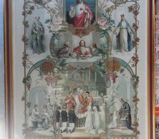 Diplôme religieux ancien encadré Jeanne Brocard a été baptisée le 25 juillet 1926, a fait sa communion solennelle le 16 juin 1937, a été confirmée le 27 juin 1937 signé de abbé ?p