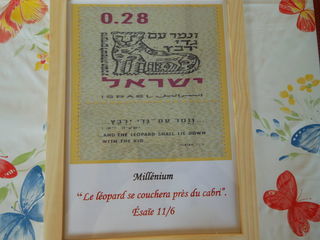 tableau dimensions 240X326 mm cadre en bois copie d'un timbre israélien représentant "le millenium : le léopard et le cabri" avec versets bibliques correspondants il y a 10 th
