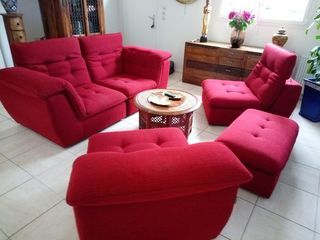 Salon modulable en tissu rouge. 4 assises avec tetières et pouf ( marque cuir center ) prix d'achat 2400 euros entièrement déhoussable Dimensions: 2 fauteuils 2 m par 2 m et 2