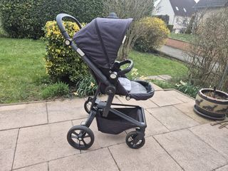 Poussette avec coque assortie, de couleur noire, avec capote et rangement sous le siège. Livrée avec un cosy qui peut être fixé sur la poussette ou utilisé séparément. L'ensemble e