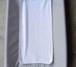 Matelas gris, rebord anti chute . Fourni avec 2 petites serviettes blanches avec velcro anti glisse. Tres bon état
