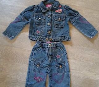 Bleu jean, dessins roses, coton. Pantalon : longueur 39 cm, taille 20 cm, hanches 25 cm, entre-jambes 20 cm. Blouson : longueur 28 cm, épaules 21 cm, sous-aisselles 29 cm, hanches