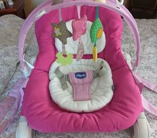 Transat Chicco, rose, évolutif de la Naissance à 18 kg. Position fixe, à bascule, avec barre de jeux. Dossier réglable & coussin réducteur, fermeture compacte, polyester. Transacti