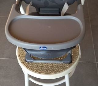 Vends une chaise haute pour bébé jusqu'à 3/4 ans environ, en bon état générale et très propre. Pour la protégée j'ai confectionné une housse assortie. Bretelles réglables. Elle dis