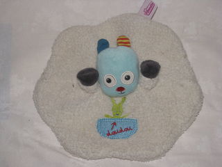 Doudou animal bleu tout doux Plat oval blanc, fonction marionnette Petit lapin vert et poche en broderie en tres bon etat
