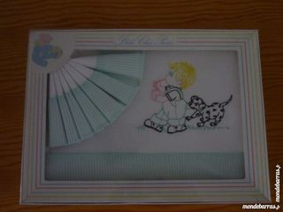 Parure draps + taie oreiller pour lit bébé. Dimensions : 120 cm x 165 cm. Etat neuf dans boite d'origine.