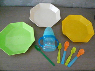 Lot composé de : - 3 assiettes octogonales en plastique. Lavables au lave-vaisselle. - 5 cuillères. - 1 tasse d'apprentissage Marque Tigex ? Tasse sans bisphénol ? Peut servir d