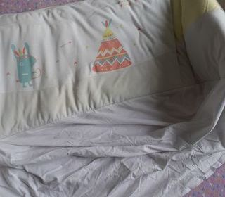 Vends un tour de lit en coton couleur blanc et jaune clair avec drap, 100 % polyester, doublure 100% coton, marque Sucre d'Orge. Dimensions face 60 X 33 cm. Dimensions côtés 44 X