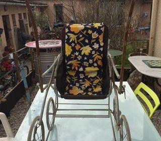 Ancienne poussette pour poupée des années 50. Poussette en métal repliable avec roues à rayon d'origine, poignée en acier et housse en plastique (toile cirée). Poussette d'époqu
