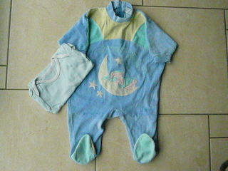 Ensemble taille 12 mois composé de : - 1 pyjama bleu, vert et jaune, - 1 body manches courtes. Très bon état. N'hésitez pas à regarder mes autres annonces pour réduire les frai