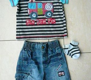 Ensemble composé de : - Un bermuda en jean, - Un tee-shirt assorti, - Une paire de chaussettes assorties. Très bon état. N'hésitez pas à regarder mes autres annonces pour rédu
