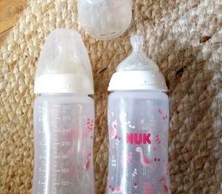 2 biberons Nuk 300 ml + tétine anti colique + couvercle tétine voir foto thème flamand rose De nombreux jouets / accessoires pour bébé et enfant à vendre, consultez mes annonc