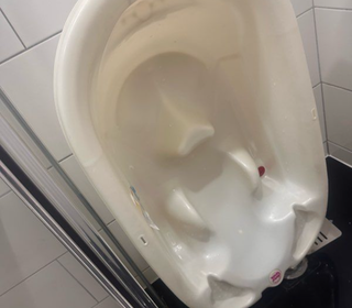 Baignoire bébé blanche avec repose-tête intégré et formes ergonomiques, adaptée pour le bain des nourrissons. L'objet est en plastique, avec une zone antidérapante moulée et des em