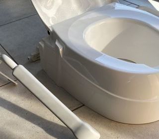 Réhausseur WC Invacare modèle Aquatec 900, ajustable en hauteur de 6,10 ou 15 cm, avec accoudoirs relevables, poids maxi utilisateur 120 kgs, compatible toutes cuvettes Servi 1 m