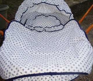 beau couffin des années 1970 en rotin avec son support pliable stable entièrement garni tissu blanc e bleu marine entretien très facile déhoussable entièrement dimensions : large