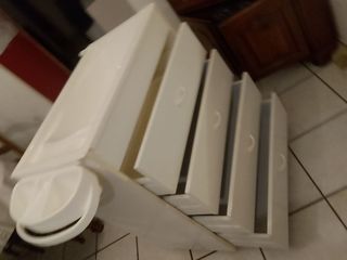 Baignoire pour bébé encastrée dans une commode de 4 tiroirs blancs . Baignoire avec tuyau évacuation d'eau. Meuble blanc et sur roulettes. En bon état
