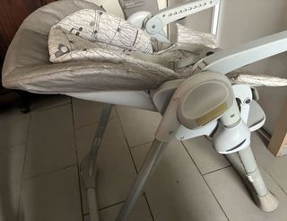 Chaise haute pliante Polly de marque Chicco. 3 positions du siège et du repose pieds, 2 positions en hauteur. Accoudoirs rabattables. Déplacements facilités par roulettes. Tablette
