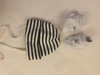 1 bonnet et une paire de chaussons pour bébé de 1 mois 3€ Possibilité 19 vêtements : 4 pyjamas dont deux Absorba, 1 pull Boutchou, 8 bodies, 2 vestes, 1 sweat, 1 salopette, 1 bonn