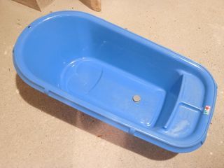 aignoire bébé bleu MARQUE : THERMOBABY (fabriqué en France) Modèle : LUXE Avec bouchon de vidange, repose jeux/savon/éponge grâce aux rebords Usure normale d'utilisation, peut