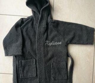 Sortie de bain / Peignoir avec capuche de marque 3 Suisses taille 24 mois. 2 poches devant. Couleur gris anthracite. Matière éponge. Brodé avec le prénom Kyliann (Possibilité de