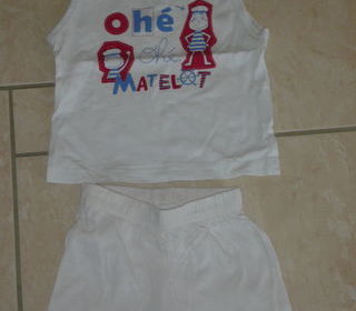 Ensemble composé de : - Un short blanc, - Un débardeur assorti. Très bon état. N'hésitez pas à regarder mes autres annonces pour réduire les frais de port. 5 € l'ensemble