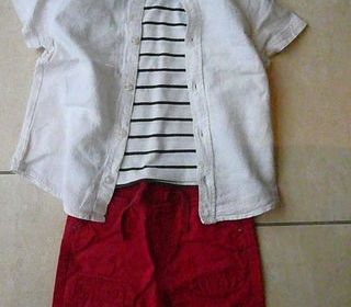 Ensemble 3 pièces taille 3 ans composé de : - Un short rouge ? ceinture élastique, - Un tee-shirt blanc à rayures bleu marine - Une chemise blanche manches courtes. Très bon ét