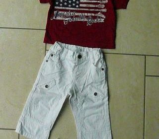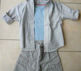 Ensemble taille 3 ans composé de : - Un short à rayures ? ceinture élastique, - Un tee-shirt blanc assorti, - Un tee-shirt assorti bleu Cafayate Argentine. Très bon état. N'hé