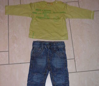 Ensemble composé de : - Un jean bleu ? Marque Obaïbi, - Un tee-shirt manches longues vert anis. Très bon état. N'hésitez pas à regarder mes autres annonces pour réduire les fra