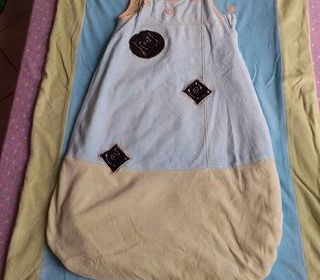 Vends une couette en velours des 2 côtés, 75 % coton, 25 % polyester, couleur bleu clair et jaune, marque Caramouille. Dimensions de la couette : 117 X 74 cm Taille de la gigoteu