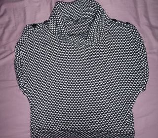 PULL moucheté noir/blanc . sans manche avec ouverture sur les côtés . col . taille 40 . 2 boutons de chaque côté des épaules en décoration . acrylique/élastane .