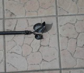 Très jolie tringle à rideaux métallique couleur bronze . Coulissante à longueur variable de 1,80 m (minimum) à 2,50 m ( maximum ) Décorée à ses extrémités d'un motif représenta