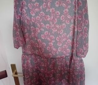 ROBE FEMME COULEUR FOND GRIS FLEURS ROUGES TAILLE 40 MANCHES LONGUES ENCOLURE RONDE ENTIEREMENT DOUBLEE FERMEE PAR 1 BOUTON A L'ARRIERE LARGEUR EPAULES 38 CM AISSELLE A AISSEL