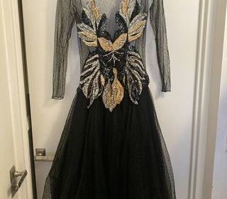 Robe du soir en tulle noir incrusté d'un papillon en sequin brodé. Bon état, mais avec une petite déchirure sur le côté. Taille : 38 Deux trous sous les aisselles sont prévus po