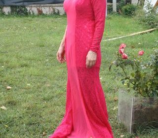 fermeture au dos avec une manche longue coté gauche et une bretelle avec décor stras descends jusqu'au pied