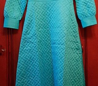 Jolie robe d'intérieur, robe de chambre en satin matelassé turquoise, avec broderies devant, petit col droit et 2 poches fendues sur les côtés Fermée dans le dos par zip Taille 3