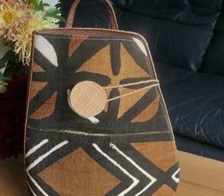 Sac pour femme à porter dans le dos, motif africain, matière naturelle d'Afrique (coton + tiges tissées, cuir pour les attaches), couleur beige au dos, zip de 40 cm sur le haut et