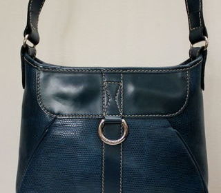 Sac cuir bleu bandoulière LANCEL cuir fermeture zip siglé rivets siglés H 19 cm L 24 cm P 5 cm 1 poche siglée int doublure siglée TBE (légères traces d'usage) Envoi possi