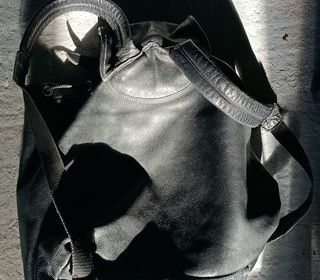 Cuir noir, PARFAIT ETAT. Largeur 28 cm, Hauteur 29 cm, Soufflet 11 cm Pot cirage pour l'entretien fourni.