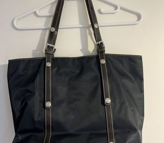 Porté épaule, lanières réglables par des boutons pression Cuir et toile. Doublure bleue. 42(largeur) 30 (H) Profondeur fond 13 Remise en main propre sur la Défense
