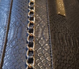 Sac à main noir de la marque KATE LEE effet "écailles", tout cuir, fermetures métallique or clair, 1 poche avant à fermeture zippée avec rabat, 1 poche à fermeture zippée sous le r
