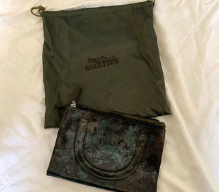 Jean Paul Gaultier luxe, authentique Petit sac pochette de luxe en toile synthétique irisé vert, marron façon caméléon 4 pochettes, 2 avec fermeture éclair 2 anses sur les côtés