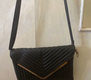Sac à main en simili cuir noir verni chic et très abordable en très bon état. Muni d'une pochette avant simple et d'une pochette dorsale avec fermeture éclair qui fonctionne très
