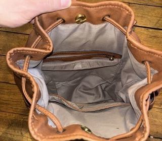 Sac à dos cuir chocolat LA BAGAGERIE cuir 100 % marron foncé fermeture lien + rabat et mousqueton 2 poches extérieure zippées + 1 poche latérale zippée 1 poche zippée int. H 3