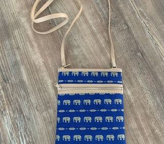 Vends Sacoche femme thailandaise motif " Eléphant " avec 2 ouvertures - Couleur bleue / marron - Dimensions hauteur 20 cm : largeur 15 cm - T