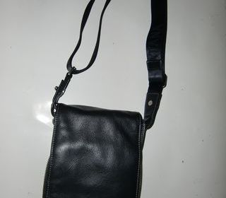 Petit sac en cuir noir pour Homme, bandoulière réglable, un gros compartiment fermé avec une fermeture éclair dans lequel il y a une poche (elle-même fermée avec une fermeture écla