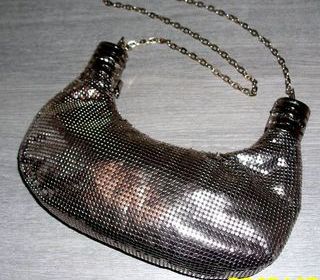 Petit sac pour sortir en maille jersey métal argenté fermé par une fermeture éclair entièrement doublé en satin brun avec chaine/bandoulière de 70 cm permet de le porter à l'
