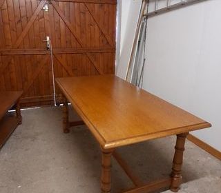 une grande table de salle à manger trés bonne qualité longueur 1m50 plus 2 rallonges de 50 cm. largeur 98 cm en trés bon état faite par un artissant menuisier ébiniste.lyonnais. à